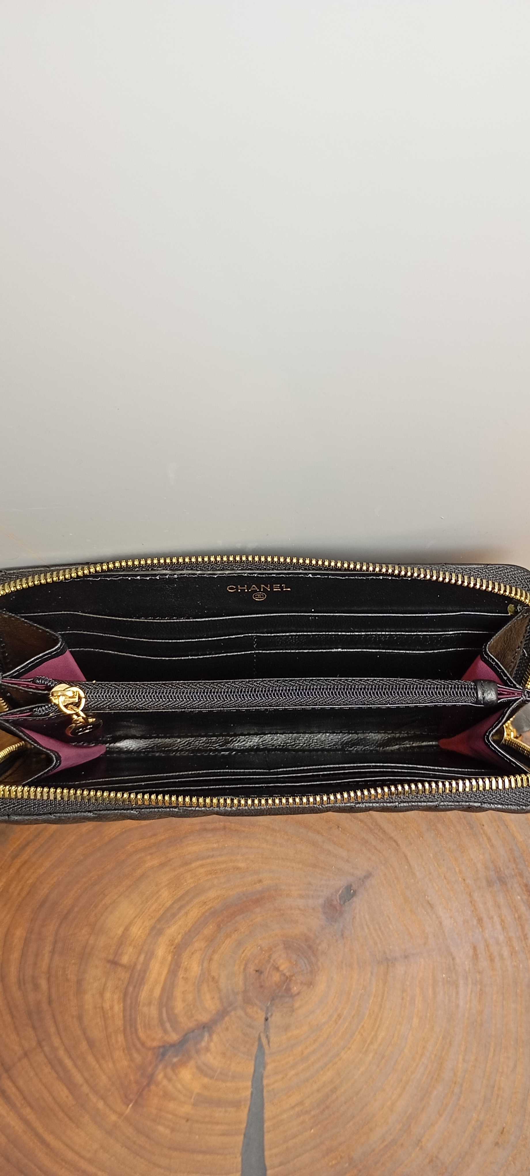 کیف چنل رنگ مشکی با چرم گاوی میباشد ، دارای دو جیب و هشت جای کارت در دو طرف و یک زیپ در وسط میباشد .و آرم چنل به صورت طلاکوب نقش بسته است.تمام آرم و نشان ها و حتی سر زیپ ها از خود برند چنل هستند که به هیچ عنوان تغییر رنگ نمیدهند.